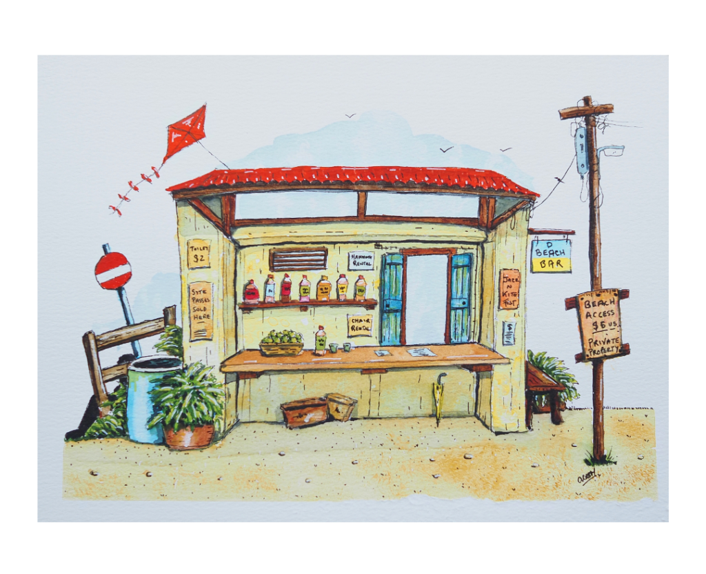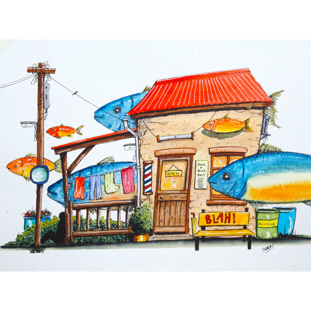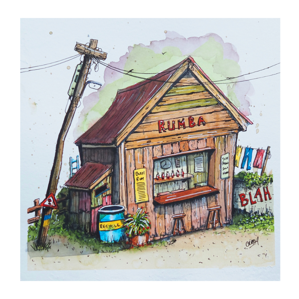 Outside Edge is the name I’ve given to the creative lens through which I view Dominica island life. Although I have intimate knowledge of this place, I will always be an outsider looking in, and nothing can change that. I’m comfortable existing in this space, as an observer on the outside edge, and my art reflects this perspective. In essence, it’s an offbeat take from the margins in the form of whimsical and surreal ink-and-watercolour sketches of entirely imagined, island-inspired urban buildings and streetscapes.