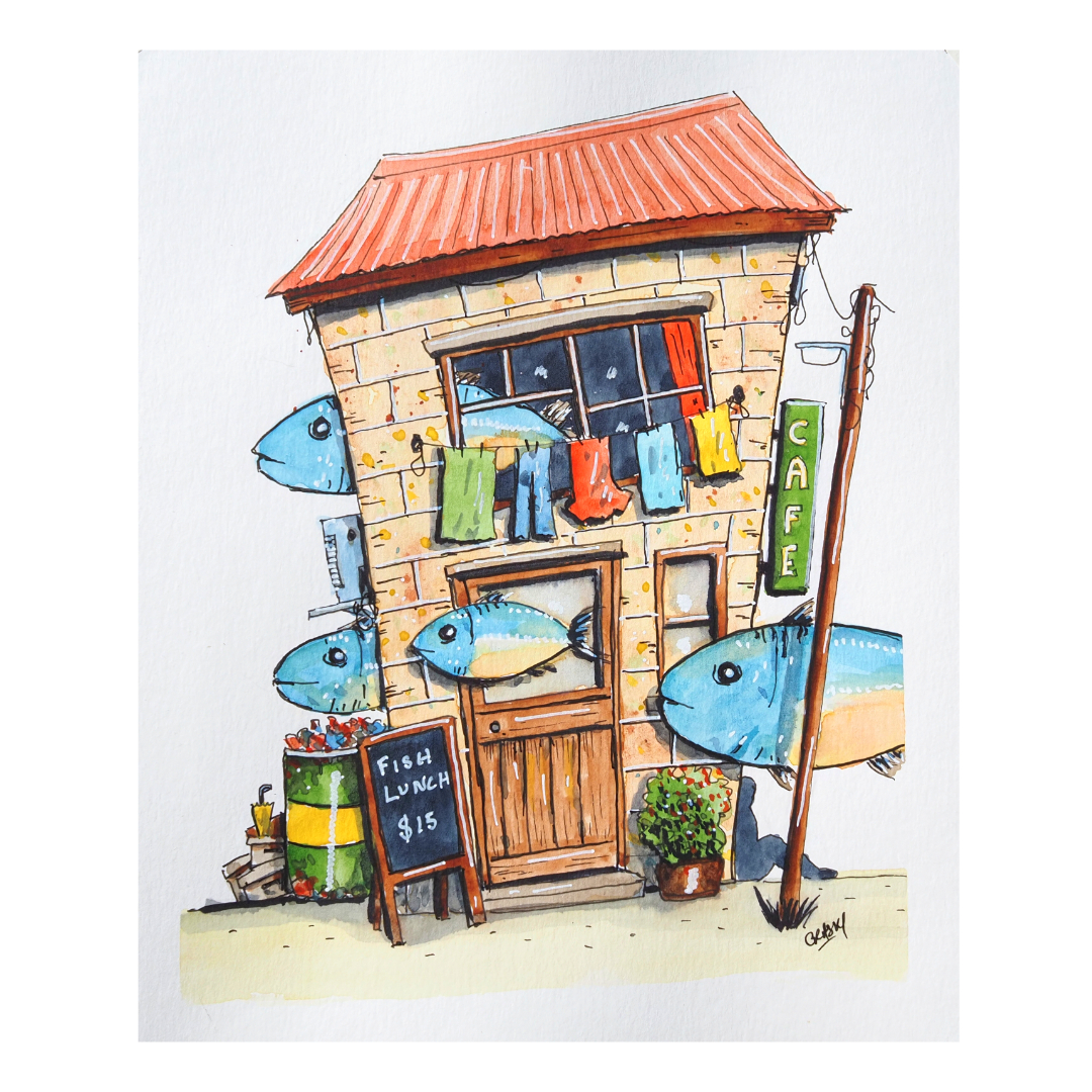 Fish Lunch Original artwork. Ink and watercolour on 300gsm paper. Unmounted. Price: EC$300 Contact by email: paulcrask@gmail.com PREVIOUS PROJECT← The Fish and the Courthouse NEXT PROJECTThe Fish and the Banana Shed →