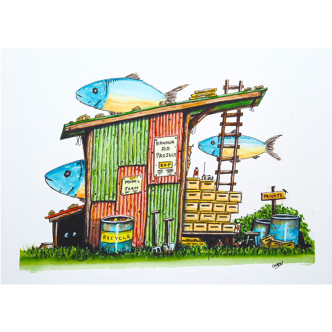 The Fish and the Banana Shed Original artwork. Ink and watercolour on 300gsm paper. Unmounted. Price: EC$300 Contact by email: paulcrask@gmail.com PREVIOUS PROJECT← Fish Lunch NEXT PROJECTThe Fish and the Barbershop →