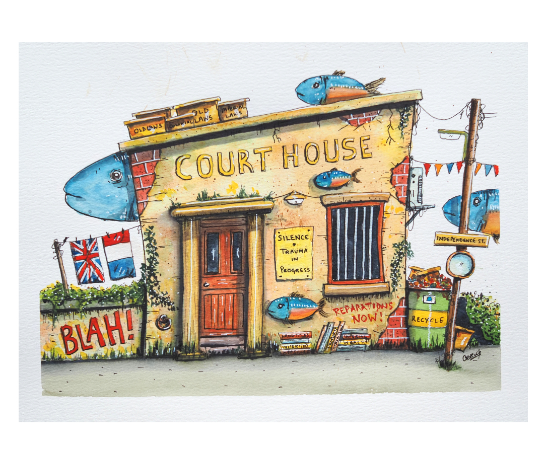 The Fish and the Courthouse Original artwork. Ink and watercolour on 300gsm paper. Unmounted. Price: EC$300 Contact by email: paulcrask@gmail.com NEXT PROJECTFish Lunch →